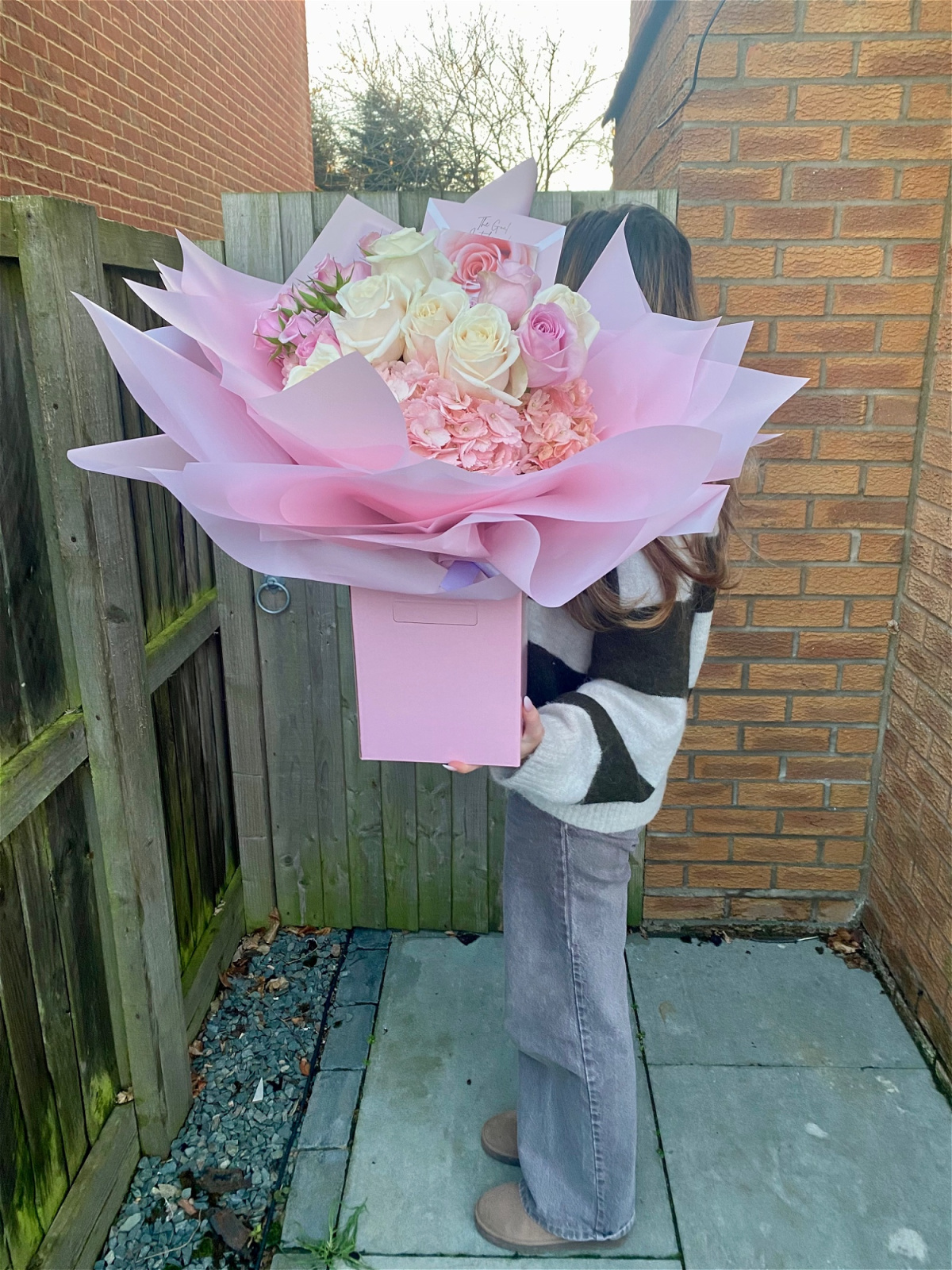 A pink and white hand-tied bouquet made to your chosen price using seasonal spray roses, single roses, and hydrangeas. Shades and flower types may vary slightly depending on wholesaler availability.
